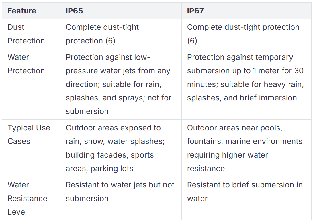 เลือกไฟ LED ที่มีการกันน้ำสูง เช่น IP65 หรือ IP67 ระดับเหล่านี้ช่วยปกป้องแสงจากฝน ฝุ่น และน้ำ