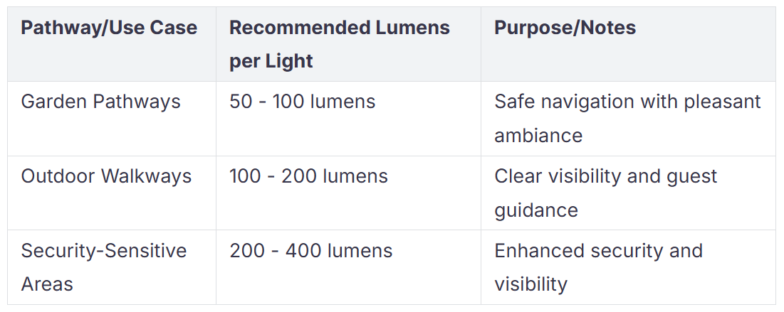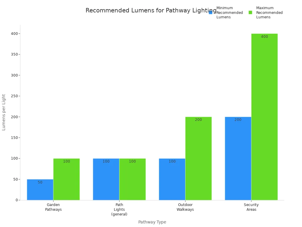 สิ่งสำคัญคือต้องมีเส้นทางที่ปลอดภัยด้านนอก ไฟส่องสว่างทางเดินช่วยให้ผู้คนเห็นว่าควรเดินไปที่ไหน นอกจากนี้ยังหยุดการเดินทางและการตก สำหรับทางเดินในสวน ให้ใช้ไฟส่องสว่าง 50–100 ลูเมน ทางเดินต้องใช้แสงสว่าง 100–200 ลูเมน หากคุณต้องการความปลอดภัยมากขึ้น ให้ใช้ความสว่าง 200–400 ลูเมนต่อไฟ วางไฟ LED กลางแจ้งให้ห่างกัน 6-8 ฟุตเพื่อให้แสงสว่างสม่ำเสมอ เส้นทางแคบต้องมีแสงไฟอยู่ใกล้กันมากขึ้น ทางเดินกว้างอาจมีแสงสว่างอยู่ห่างจากกัน วางไฟให้สูงจากพื้นดินประมาณ 14 นิ้ว ให้ลำแสงตรงและทำให้เส้นทางดูดี