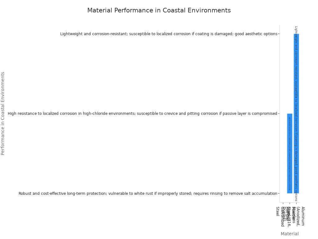 ผู้ผลิตใช้การเคลือบสีฝุ่นและฝาครอบแบบปิดผนึกเพื่อให้ไฟมีอายุการใช้งานยาวนานขึ้น คุณสมบัติเหล่านี้ช่วยให้ไฟ LED ทนฝนและแดดสามารถรอดพ้นจากพายุ อากาศเปียก และสเปรย์เกลือ คุณสามารถดูการทำงานของวัสดุต่างๆ ใกล้ทะเลได้จากแผนภูมิด้านล่าง: